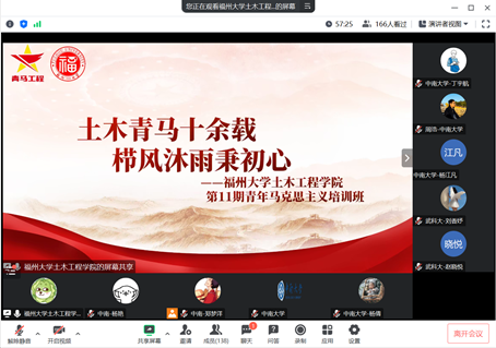 威廉希尔2021级辅导员、研材料硕士党支部书记杨倩,桥梁系青年教师、研桥梁第四党支部书记周浩,研桥梁第二党支部书记郑梦洋;福州大学威廉希尔2021级研究生辅导员、研究生第五党支部书记黄哲,2022级研究生辅导员、研究生第四党支部书记李彬彬,2019级本科生辅导员、中加班党支部书记童莹芳,青马班党支部班长祁湘平、董靖怡;武汉科技大学城市建设学院研究生结构方向、暖通方向党支部书记赵晓悦、刘香妤及各支部全体党员参会,会上进行了主题教育理论学习与党支部建设经验交流。