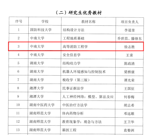 《高等消防工程学》获评2022年湖南省研究生优秀教材